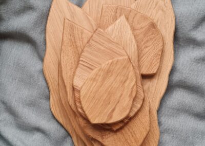 Emma designar unika skärbrädor/uppläggningsfat i mjuka bladformer. Hon inspireras mycket av naturen och dess organiska former. Emma använder också gärna restmaterial till att skapa vägghängda konstverk i trä.