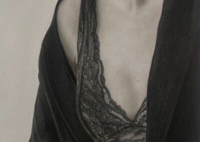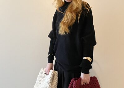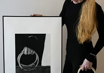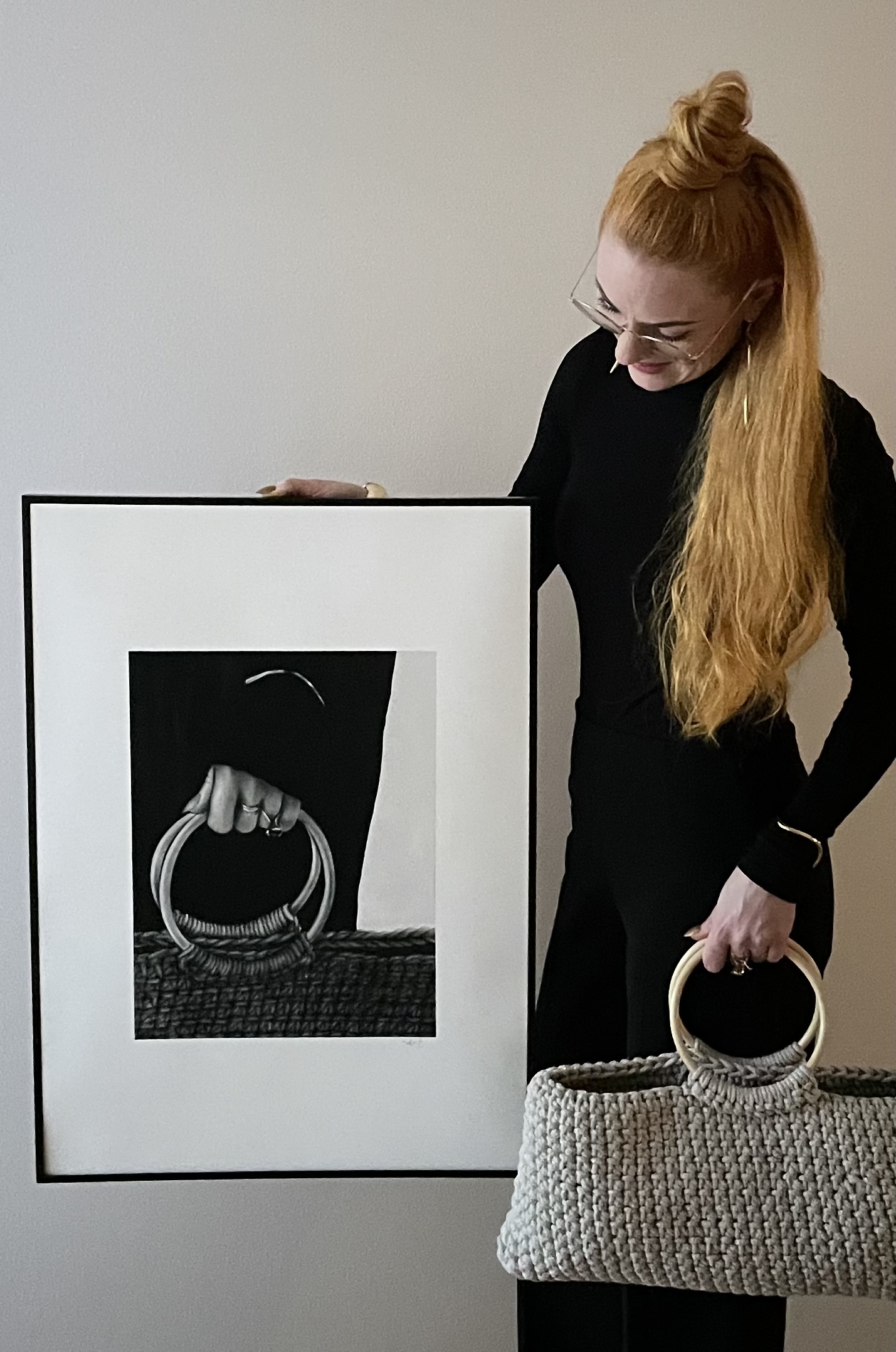 Sofia E skapar detaljrik konst i form av realistiska motiv i kol och grafit. Helt nytt är att hon även gör virkade väskor. Stilrena former där fokus ligger på detaljer genomsyras även där.