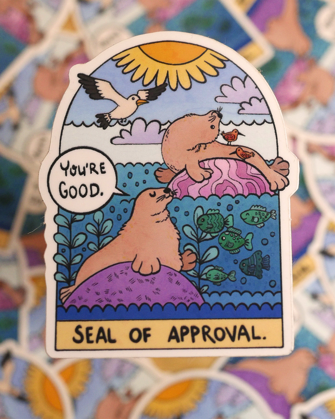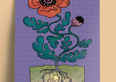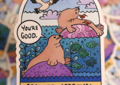 Louie makes art on the internet with the name tender rebellions – and that is what they aim for in their work. Being tender, soft, warm, and kind. While also not shying away from hard topics like mental health and queer feminism. Their work often includes bold colours and cute animals wearing party hats. You will likely walk away from their table with a small on your face!